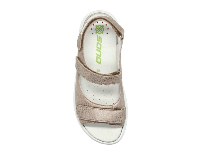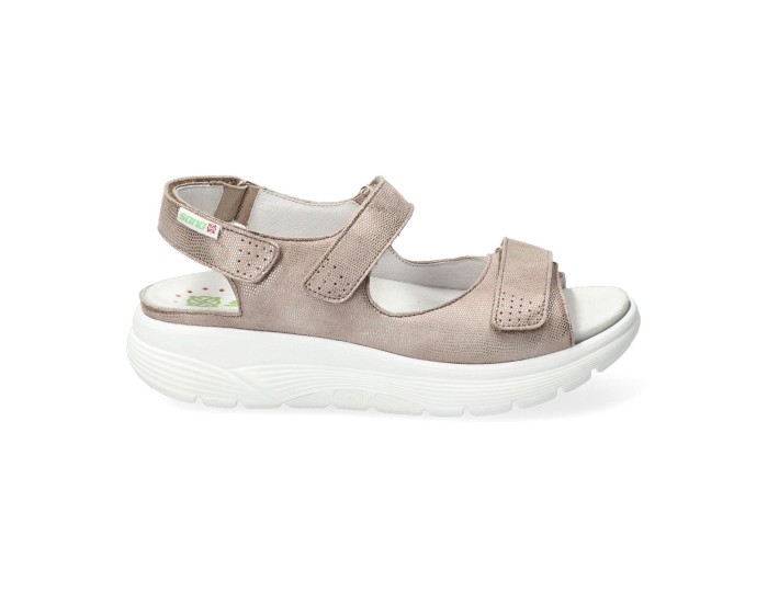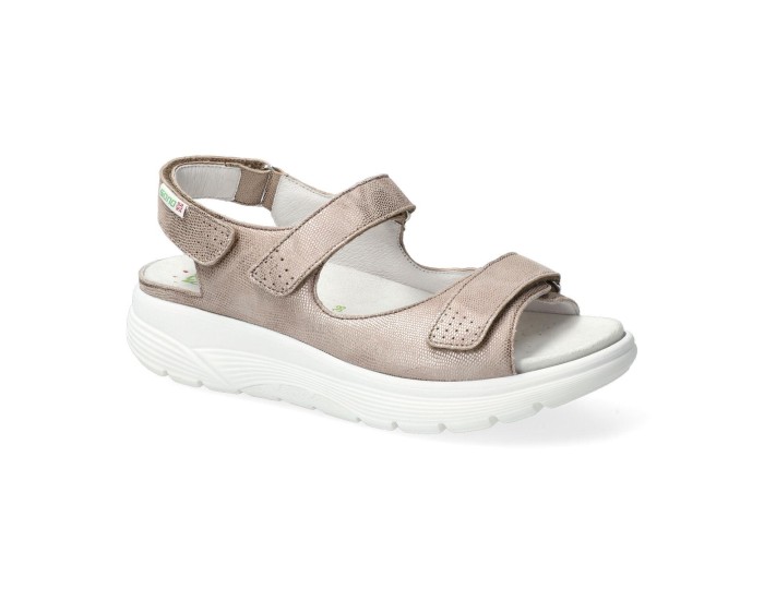 This sandal has a sporty, feminine look and stands out for its design and light weight. The removable insole with SOFT-AIR Technology can be replaced with a custom insole. The EASY-WALKING TECHNOLOGY system stimulates muscles often neglected in normal walking and encourages the natural rolling motion of the foot, while acting as a shock absorber. It combines comfort with a perfect fit thanks to adjustable hook-and-loop closures. The leather lining promotes a healthy climate and offers exceptional comfort. This light taupe women's sandal is made of textile leather combination.